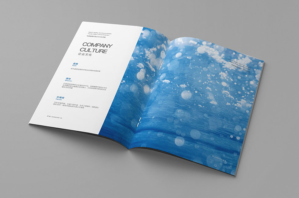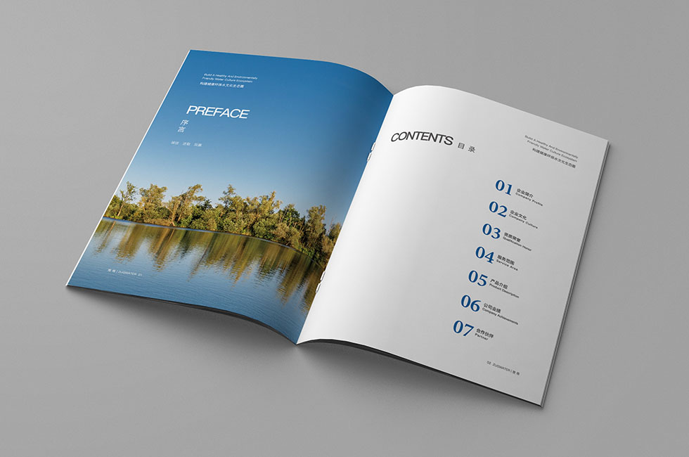 項(xiàng)目背景:楚格是以水處理工程設(shè)計(jì)與施工、水處理技術(shù)開發(fā)與設(shè)施運(yùn)營、環(huán)保成套設(shè)備制造安裝為主體的高新技術(shù)企業(yè),產(chǎn)品涉及膜技術(shù)產(chǎn)品、市政給水、市政污水、工藝給水、工業(yè)污水、工業(yè)循環(huán)水、生活污水與中水回用處理等水處理領(lǐng)域,可提供高效的項(xiàng)目咨詢與評(píng)價(jià)、工程設(shè)計(jì)與技術(shù)支持等全過程高品質(zhì)的服務(wù)。艾的爾設(shè)計(jì)承接其企業(yè)宣傳冊(cè)設(shè)計(jì)及制作,成立品牌設(shè)計(jì)小組,與企業(yè)進(jìn)行深入溝通,明確企業(yè)對(duì)于畫冊(cè)設(shè)計(jì)的需求,封面采用藍(lán)色為主,突顯