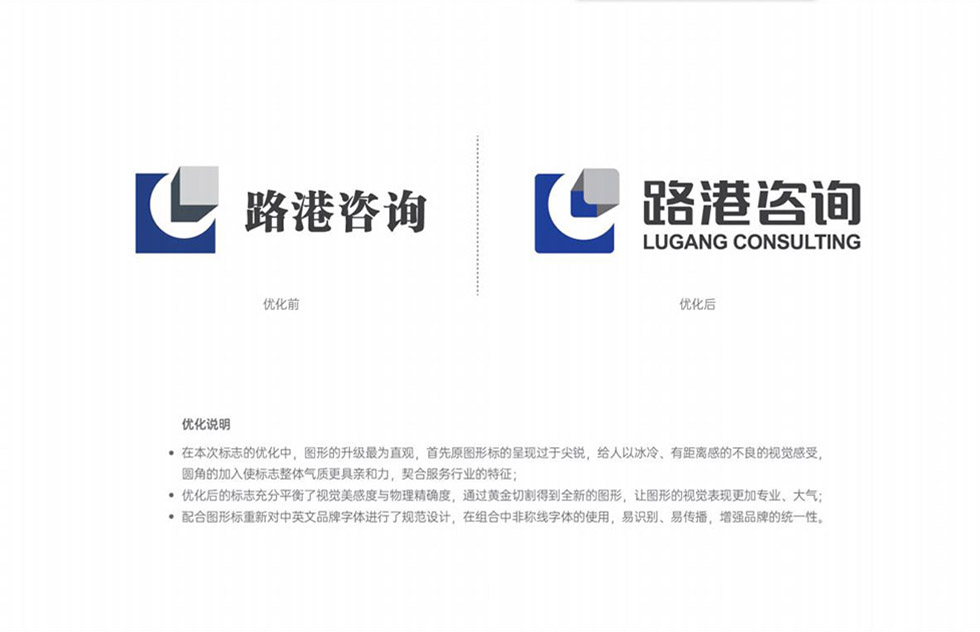 項(xiàng)目背景:湖北路港工程咨詢有限公司成立于2001年,是湖北省建設(shè)工程造價(jià)咨詢協(xié)會(huì)第四屆理事會(huì)副理事長單位,公司具有中華人民共和國住房和城鄉(xiāng)建設(shè)部頒發(fā)的工程造價(jià)咨詢甲級(jí)資質(zhì)等多項(xiàng)資質(zhì)。艾的爾設(shè)計(jì)承接其品牌VI設(shè)計(jì),與客戶深入溝通后,明確企業(yè)寓意對(duì)LOGO設(shè)計(jì)進(jìn)行優(yōu)化,在此標(biāo)志優(yōu)化中圖形的升級(jí)最為直觀,原圖形標(biāo)的呈現(xiàn)過于尖銳,給人冰冷的視覺感受,優(yōu)化后的標(biāo)志整體氣質(zhì)具有親和力,契合服務(wù)行業(yè)的特征,也通過黃金切割得到全新的圖形,視覺表現(xiàn)更加專業(yè)、大氣。