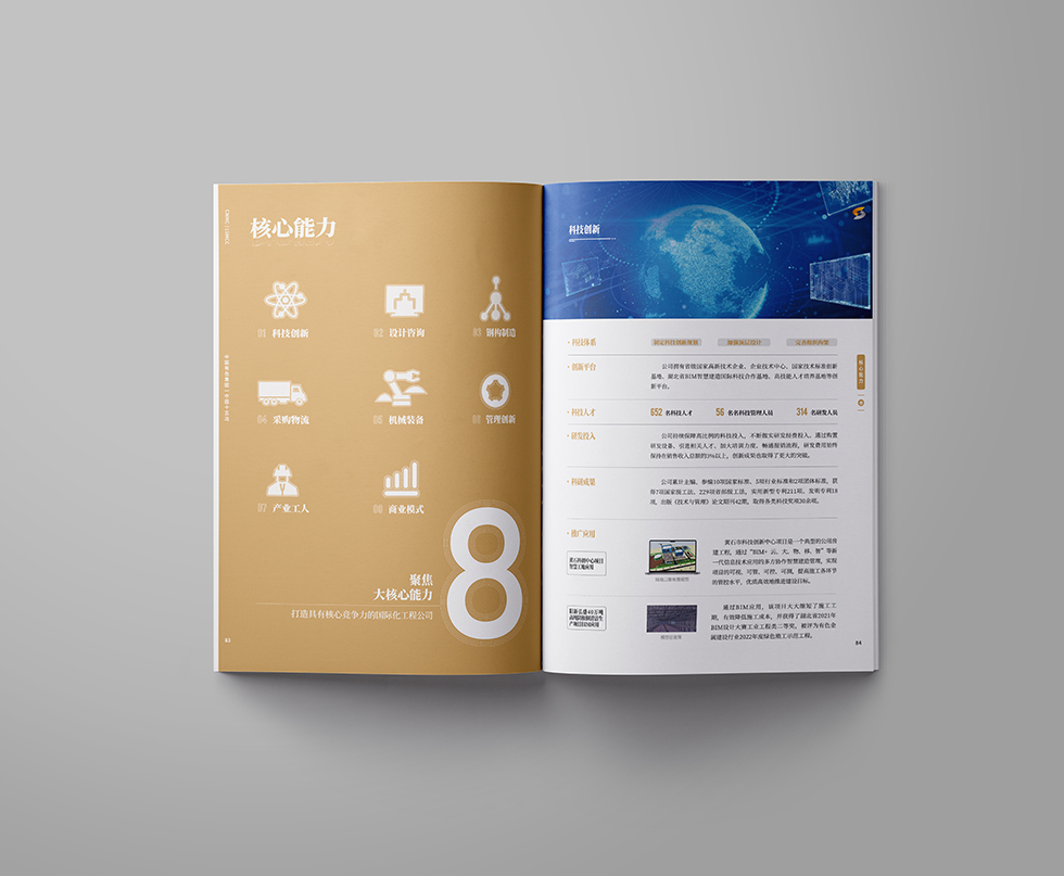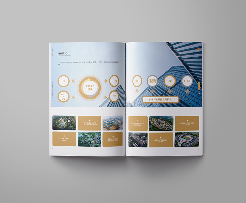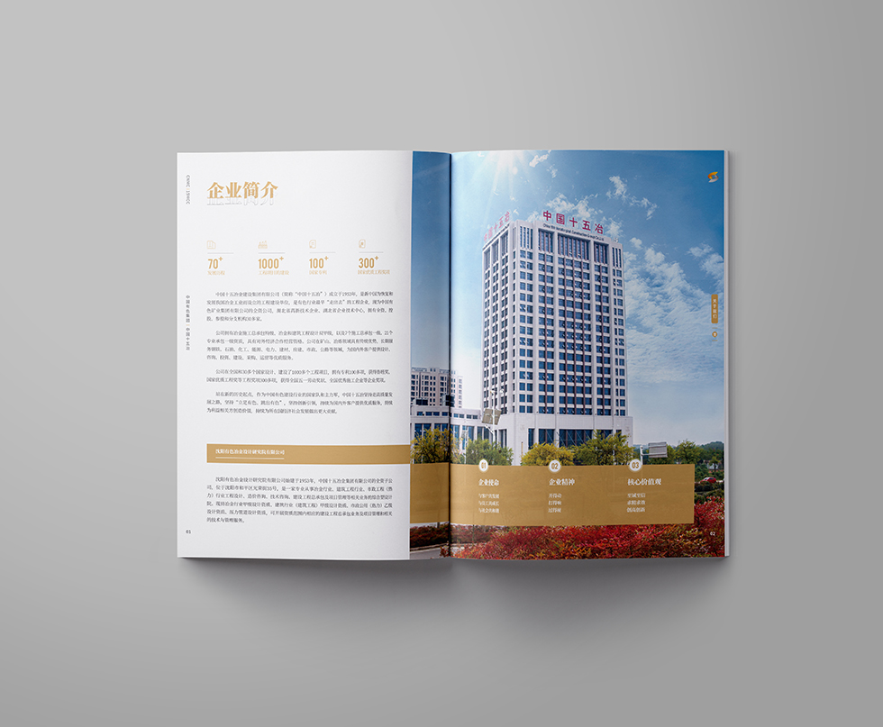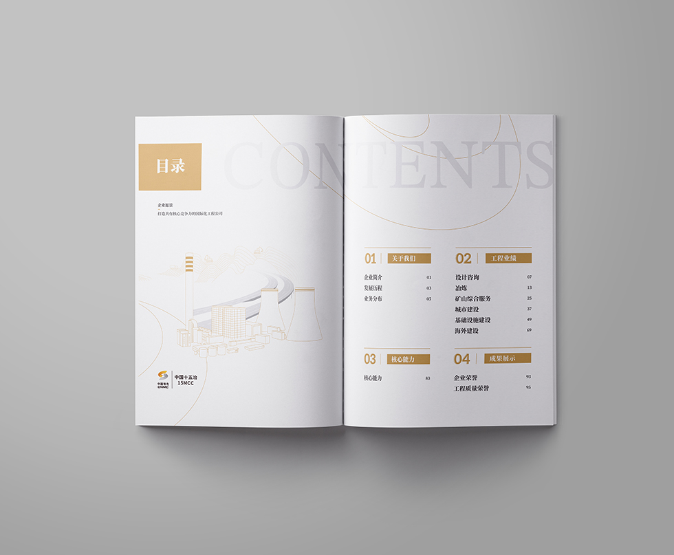 項(xiàng)目背景:中國十五冶金建設(shè)有限公司(簡稱“中國十五冶”)是具有特級總承包資質(zhì)的大型國有施工企業(yè),隸屬于國務(wù)院國資委直管的中國有色礦業(yè)集團(tuán)有限公司。中國十五冶成立于1953年,現(xiàn)有資產(chǎn)40余億元,從業(yè)人員2萬余人,其中核心管理人員約5000人;擁有施工機(jī)械設(shè)備4998臺(套),動(dòng)力裝備率為31.75kw/人,技術(shù)裝備率為130372元/人。公司擁有冶煉工程總承包特級資質(zhì),礦山工程、電力工程、公路工程、房屋建筑工程、機(jī)電安裝工程、石油化工工程、市政工程等7項(xiàng)總承包一級資質(zhì)及5項(xiàng)專業(yè)資質(zhì)。同時(shí),還具有對外經(jīng)濟(jì)合作經(jīng)營資格、進(jìn)出口企業(yè)資格和對外援助成套項(xiàng)目施工任務(wù)A級實(shí)施企業(yè)資格,可從事境外承包工程、輸出勞務(wù)和相關(guān)進(jìn)出口業(yè)務(wù)。艾的爾設(shè)計(jì)承接其畫冊設(shè)計(jì),成立品牌設(shè)計(jì)小組,與企業(yè)進(jìn)行深入溝通,明確企業(yè)對于畫冊設(shè)計(jì)的需求,封面大面留白,整體顯得干凈、大氣、識別性更強(qiáng),第一眼就能清晰明了的看到主題字。內(nèi)頁也是白色風(fēng)格為主,清晰的看到二級標(biāo)題與內(nèi)容,能夠突出企業(yè)的畫冊宣傳內(nèi)容。